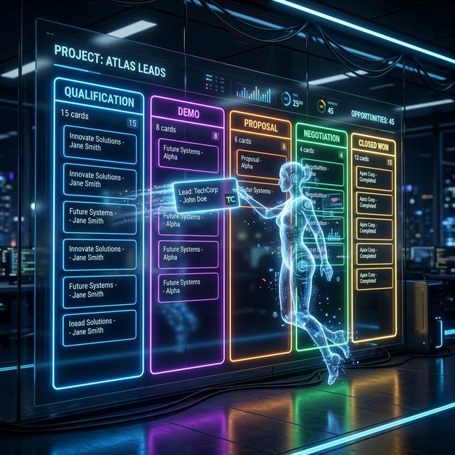 Cada conversación entra al Kanban, se califica y se asigna al vendedor correcto. El Scheduler se encarga del seguimiento a hora fija.